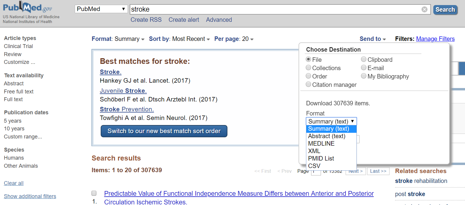 Once you have run the search in different databases, you will import all the search results in one of the following formats: ris, XML, csv, MEDLINE, etc. (Picture 1) After downloading the results, you will have to remove duplicates. You can use any of the software that I have mentioned below or even Microsoft Excel to remove duplicates, as shown below. (Picture 2 & 3)